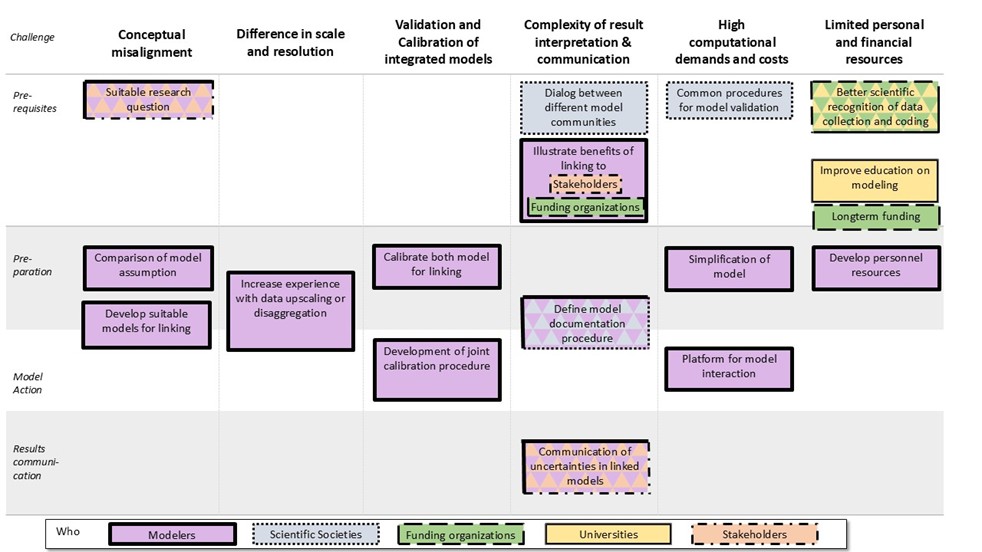 Linking computable general or partial equilibrium models with agent-based models can combine the strengths of both modeling concepts. The linking allows to trace global feedback effects while providing a flexible representation of human behavior and social interactions. This linking would facilitate the simulation of interconnected land-use and economic systems while accounting for actors’ heterogeneity, their specializations, and the representation of alternative decision models. In this paper, we examine the challenges that currently hinder the realization of these potential benefits and present a roadmap outlining possible solutions for successful model linking in the context of land use change. The main challenges include: 1) conceptual misalignment between modeling concepts, 2) differences in scales and resolution, 3) difficulties in validation and calibration of linked models, 4) increased complexity in interpreting and communicating results, 5) high demands on compu-tational infrastructure and computational costs, and 6) limited personnel and financial resources. Successfully linking different model concepts and overcoming these challenges requires the modelling communities and stakeholders to engage in long-term, platform-supported dialogue. This dialogue could facilitate the development of a shared framework for model linking, standards for model documentation, validation procedures, and appropriate approaches for communicating and evaluating results. This process will enhance the benefits and sustain the linked models while helping determine circumstances in which the advantages of linking models may outweigh the costs.